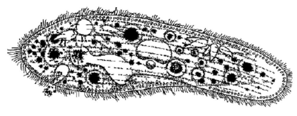 инфузория туфелька,свободноживущая,не паразит,строение свидетельствует усложнению :реснички, пищеварительная вакуоль, макронуклеус, микронуклеус, сократительная вакуоль, клеточный рот, порошица. Так же сложность состоит в процессе питания инфузории, которое напоминает процесс питания высших животных. Питание происходит при помощи околороточной реснички – мембраннелы и проходит: клеточный рот - перестом - цитостом - цитофаринскс . Попадая вглубь клетки пища обволакивается ферментированные пузыречки – везикулы, которые в последствии образуют пищеварительную вакуоль. И через порошицу происходит выделение. Пороштца характерна только для инфузорий. В процессе питания пищу обрабатывается сначала щелочью, а потом кислотой.