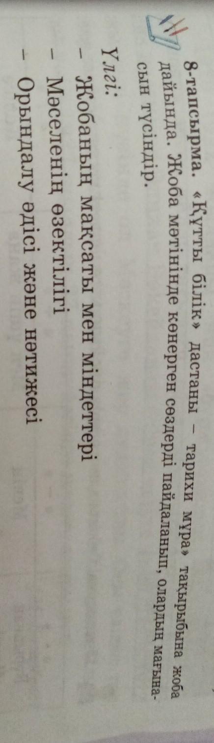 8-тапсырма. «Құтты білік» дастаны тарихи мұра» тақырыбына жоба дайында. Жоба мәтінінде көнерген сөздерді пайдаланып, олардың малыша сын түсіндір. Үлгі: Жобаның мақсаты мен міндеттері Мәселенің өзектілігі Орындалу әдісі және нәтижесі тауып берндерш