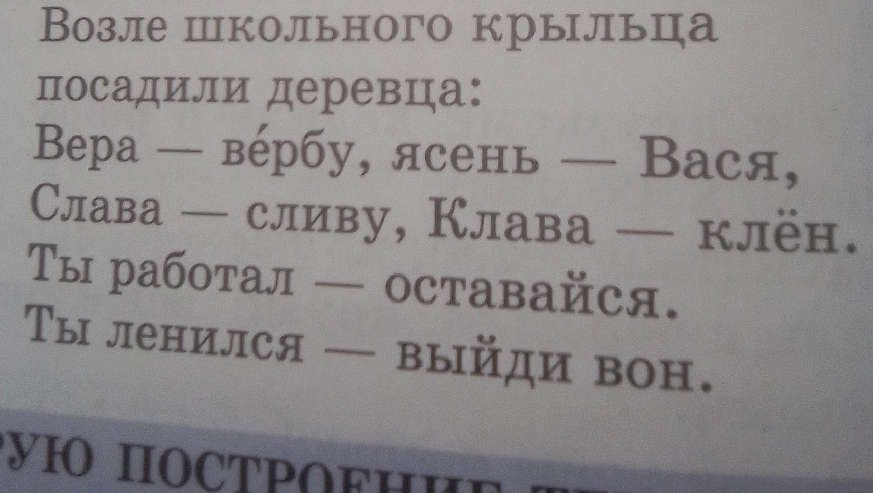 Вера вербу ясень Вася слава сливу Клава клён ты работал оставайся ты ленился выйди вон