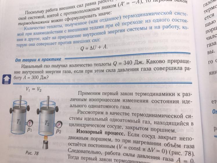 Объяснение: из формулы имеем ΔU=Q-A=340Дж-300Дж=40 Дж