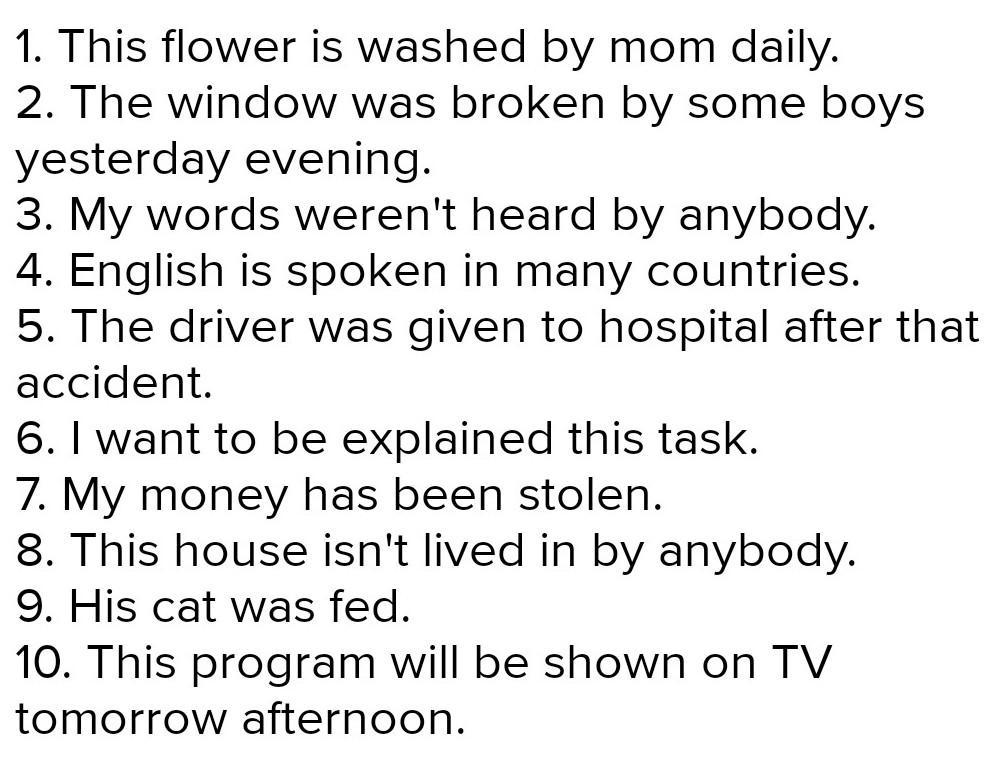 Составить 10 предложений в Passive Voice с предлогами (with , by) в present. simple, present continuous ,past simple, present perfect: и в active и в passive