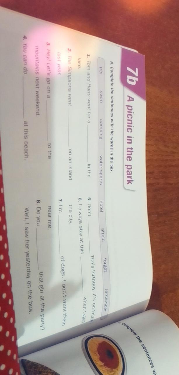 1 swim 2 camping 3 trip 4 water sports 5. forget 6. hotel 7. afraid 8 remember