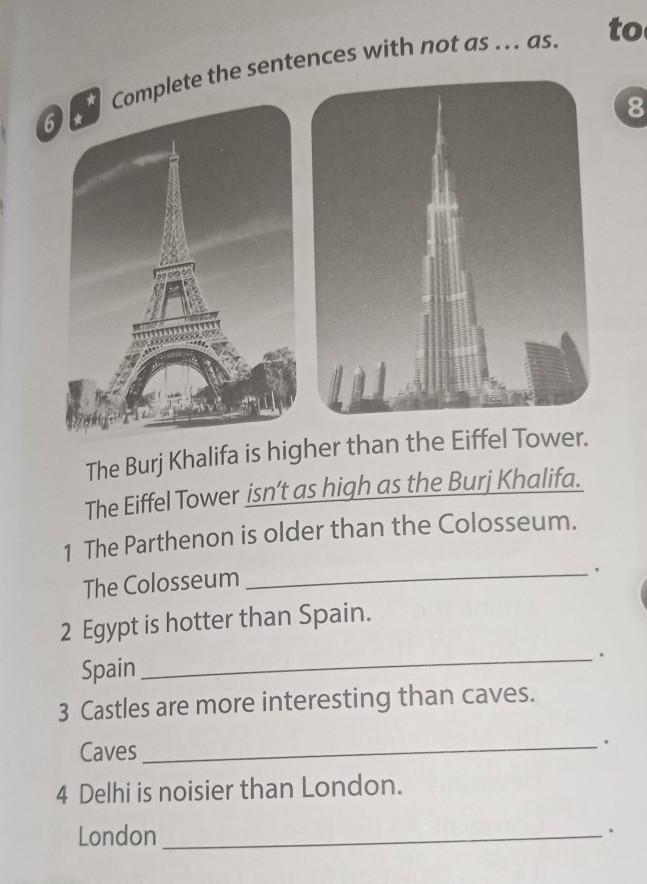Complete the sentences with not as ... as. The Burj Khalifa is higher than the Eiffel Tower. The Eiffel Tower isn't as high as the Burj Khalifa. 1 The Parthenon is older than the Colosseum. The Colosseum 2 Egypt is hotter than Spain. Spain 3 Castles are more interesting than caves. Caves 4 Delhi is noisier than London. London