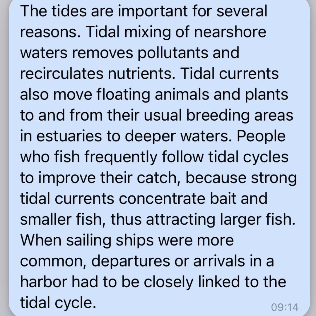 Tides are important for a number of reasons. Tidal mixing of coastal waters removes pollutants and recycles nutrients. Tidal currents also move floating animals and plants to their usual breeding grounds in estuaries and back to deeper waters. People who fish often follow tidal cycles to enhance their catches by having strong tidal currents concentrate bait and small fish, therefore attracting larger fish. When sailboats were more common, sailing or arriving in a harbor had to be closely tied to the tidal cycle.