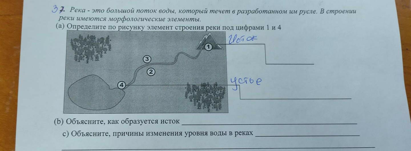 ном им русле. Д 22 Река – это большой поток воды, который течет в раз реки имеются морфологические элементы А) Определите по рисунку элемент строения реки под цифрами 1 и 4 Иerbe 2 Четы b) Объясните, как образуется исток реки c) Объясните, причины изменения уровня воды в реках