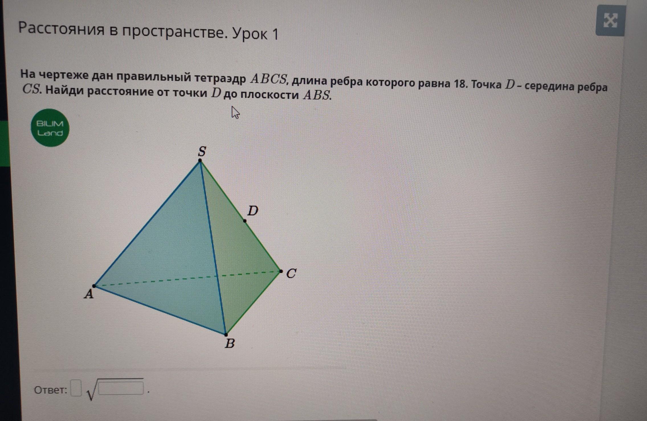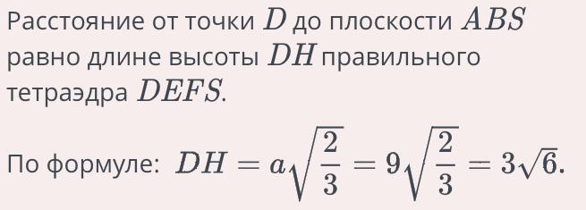 На чертеже дан правильный тетраэдр ABCS, длина ребра которого равна 18. Точка D – середина ребра CS. Найди расстояние от точки D до плоскости ABS.