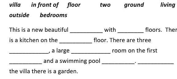 This is a new beautiful villa with two floors. There is a kitchen on the ground floor. There are three bedrooms, a large living room on the first and a swimming pool outside. In front of the villa there is a garden.