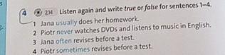 4 2.14 Listen again and write true or false for sentences 1-4. 1 Jana usually does her homework. 2 Piotr never watches DVDs and listens to music in English. 3 Jana often revises before a test. 4 Piotr sometimes revises before a test.