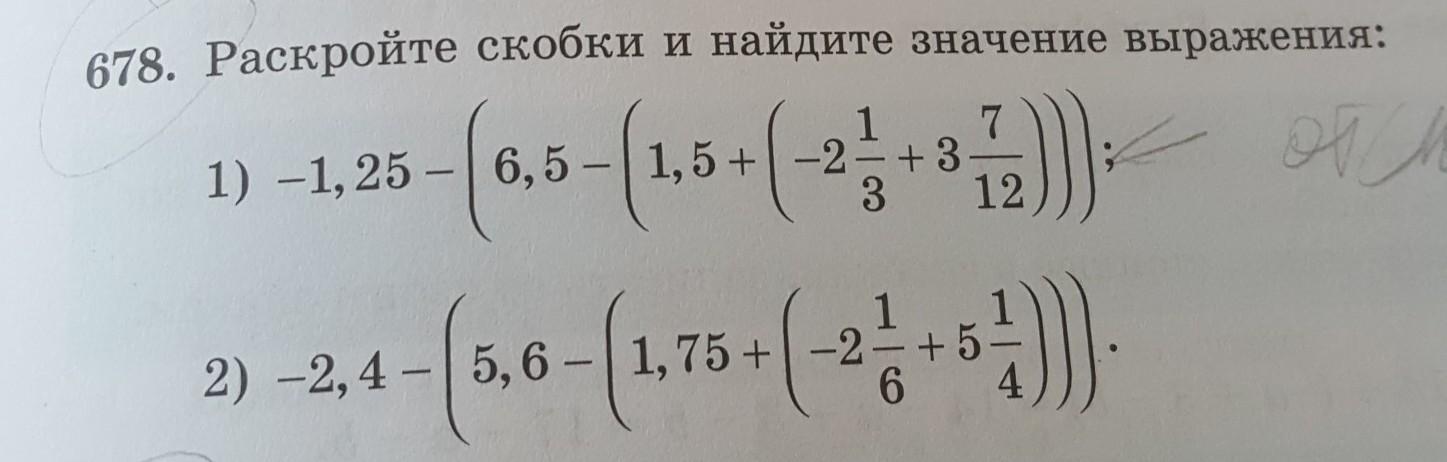 678. Раскройте скобки и найдите значение выражения: 1 ) -2- + 3 1) -1,25-(6,5-(1.5+(2+372) ((+54) и 12 1 2) -2,4-5,6 - 1,75 + -2 -2 - -