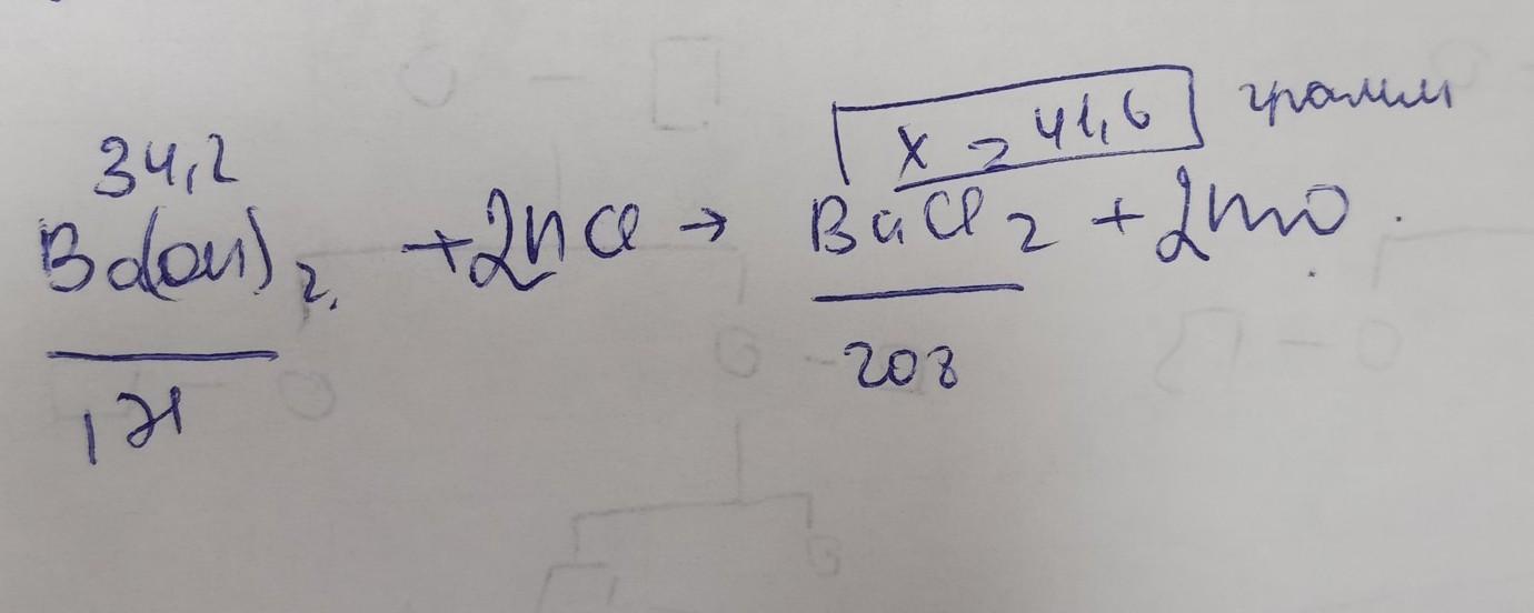 1. Вычислите массу соли, полученной при полной нейтрализации гидроксидa бaрия массой 34,2 г раствором хлороводородной кислоты,