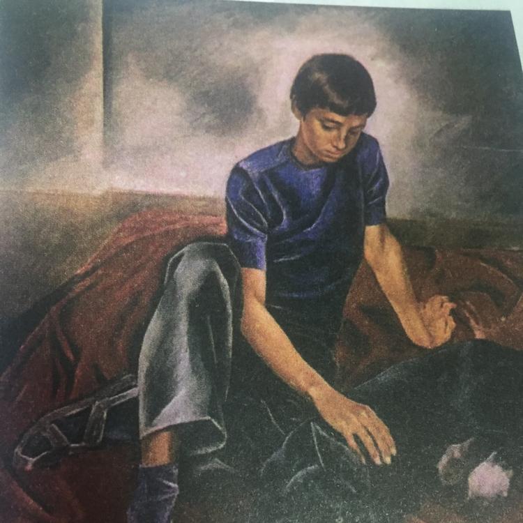 На данной картине мы можем видеть темноволосого мальчика или подростка, сидящего в тёмной комнате на полу. Вид у него грустный и задумчивый. Он гладит чёрного кота, а тот, свернувшись калачиком спит. Когда я смотрю на эту картину, у меня возникает чувство небольшого страха, как будто этого мальчика посадили в темницу или чулан. Картина выполнена реалистично и со всеми деталями. Мне нравится любоваться ею.