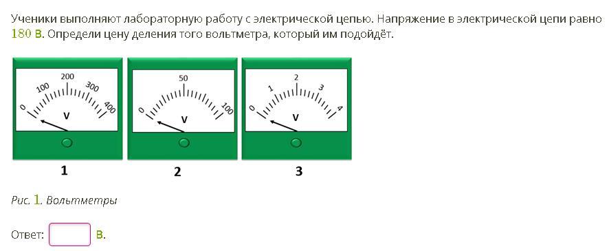 Ученики выполняют лабораторную работу с электрической цепью. Напряжение в электрической цепи равно 180 В. Определи цену деления того вольтметра, который им подойдёт.