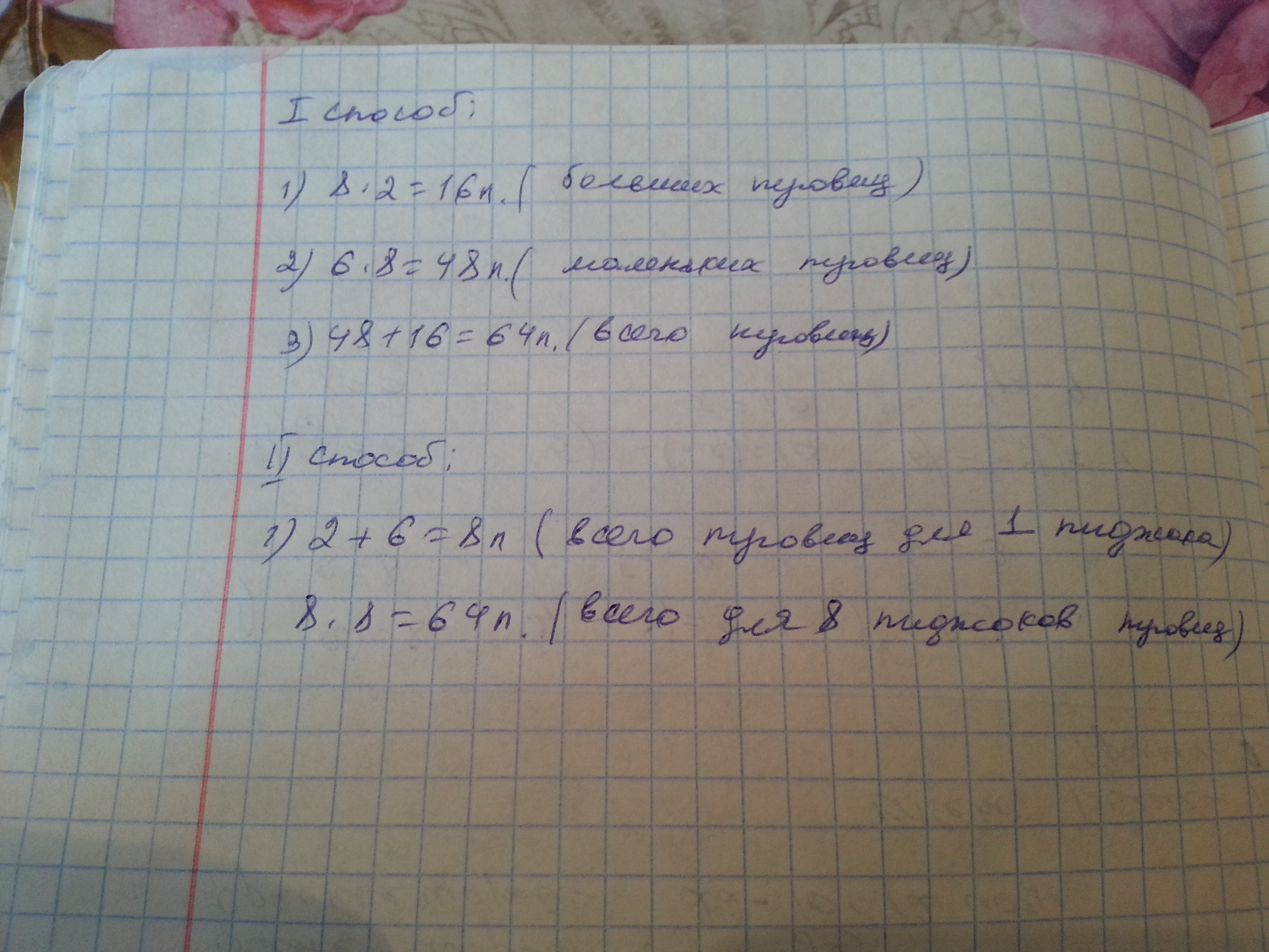К каждому пиджаку пришивают 2 большие пуговицы и 6 маленьких. Сколько всего пуговиц нужно для 8 пиджаков? Реши задачу двумя способами.