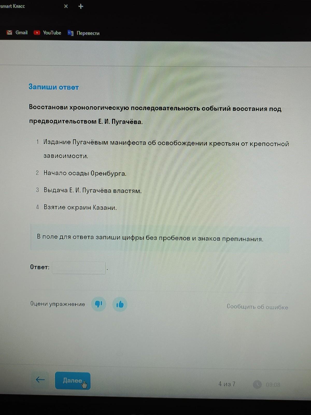 Восстанови хронологическую последовательность событий восстания под предводительством Е. И. Пугачёва:
