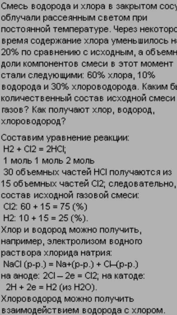 состав исходной смеси газов? Как получают хлор, водород, хлороводород?