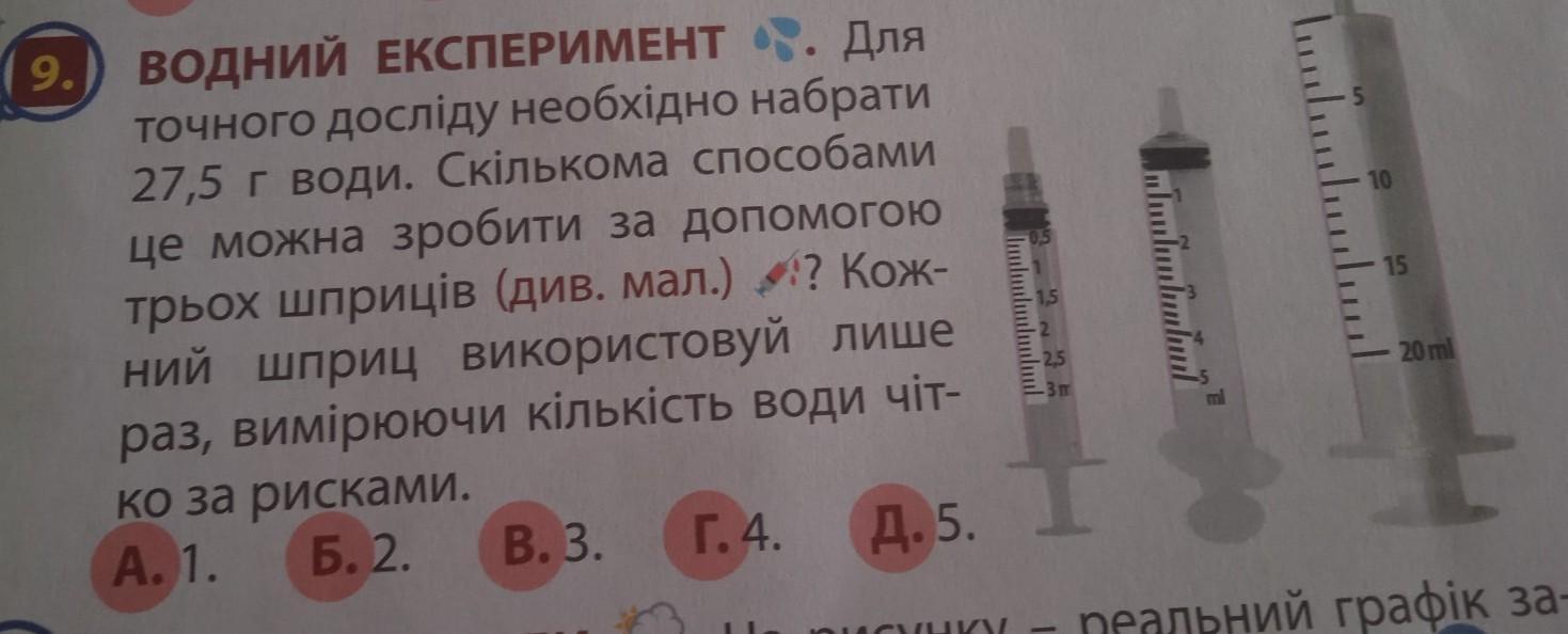 Для точного досліду необхідно набрати 27,5 г води. Скількома способами це можна зробити за допомогою трьох шприців (див. мал.)