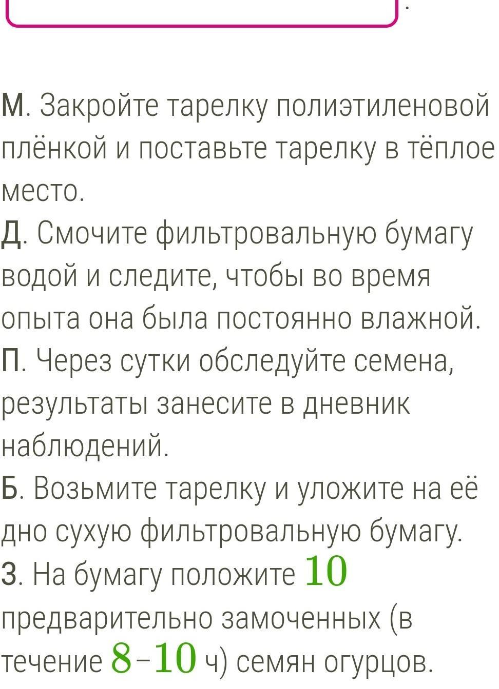 Определи верную последовательность действий при закладке опыта по проращиванию семян. В ответе запиши соответствующую последовательность букв (без пробелов):