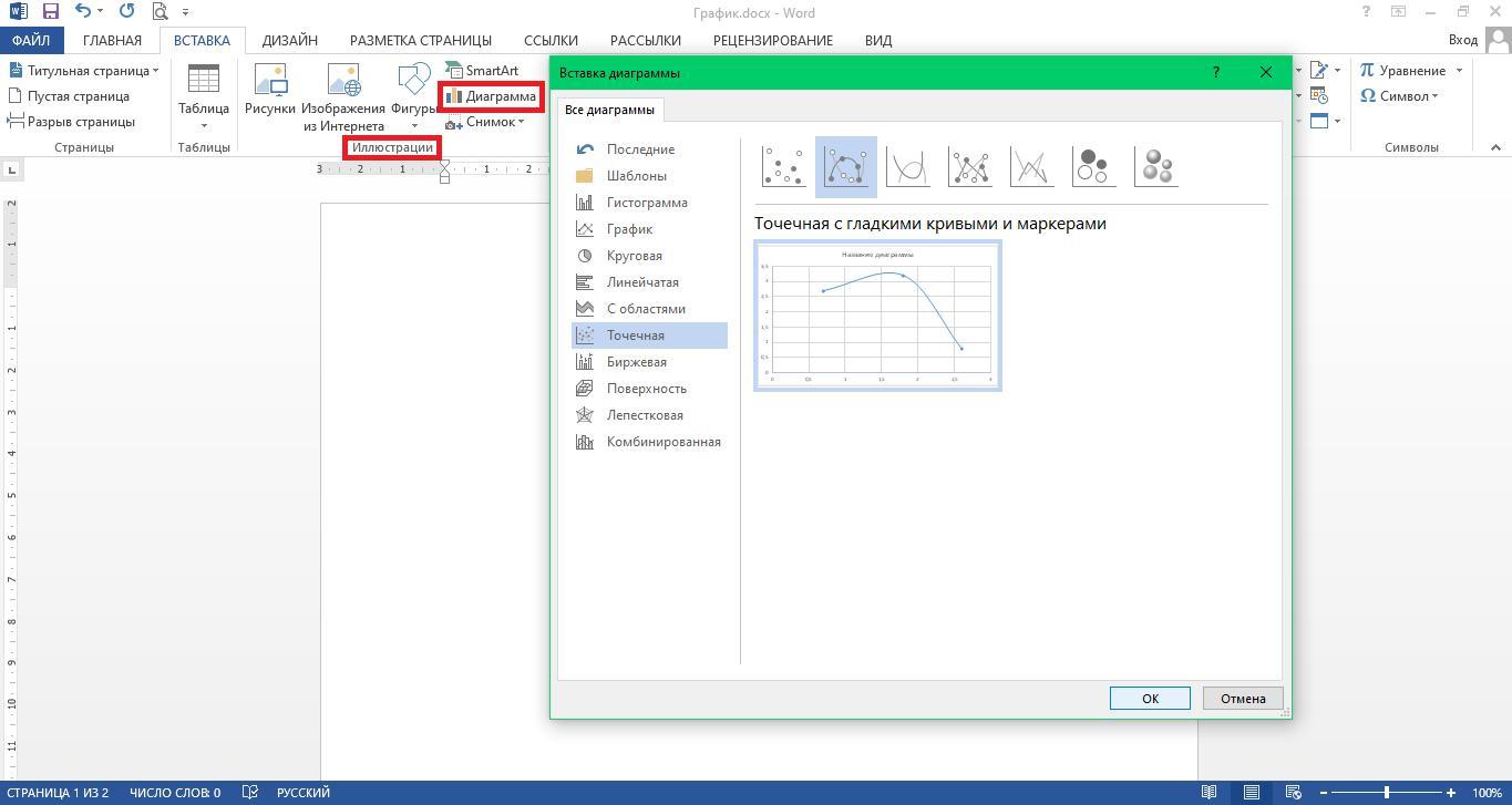 Вкладка ВСТАВКА - группа Иллюстрации - Диаграммы - Точечная - Точечная с гладкими кривыми и маркерами - Ок
