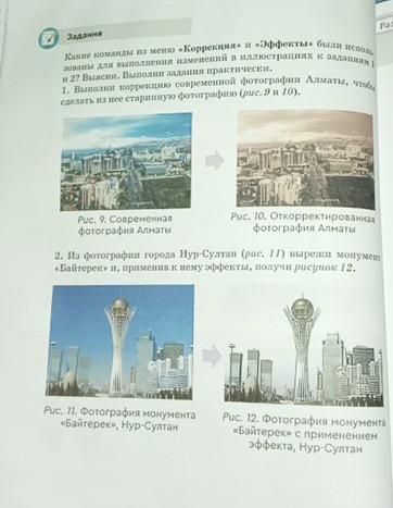 Разде Задания Какие команды из меню «Коррекция» и «Эффекты» были исполь зованы для выполнения изменений в иллюстрациях к заданиям 1 и 2? Выясни. Выполни задания практически. 1. Выполни коррекцию современной фотографии Алматы, чтобы сделать из нее старинную фотографию (рис. 9 и 10).