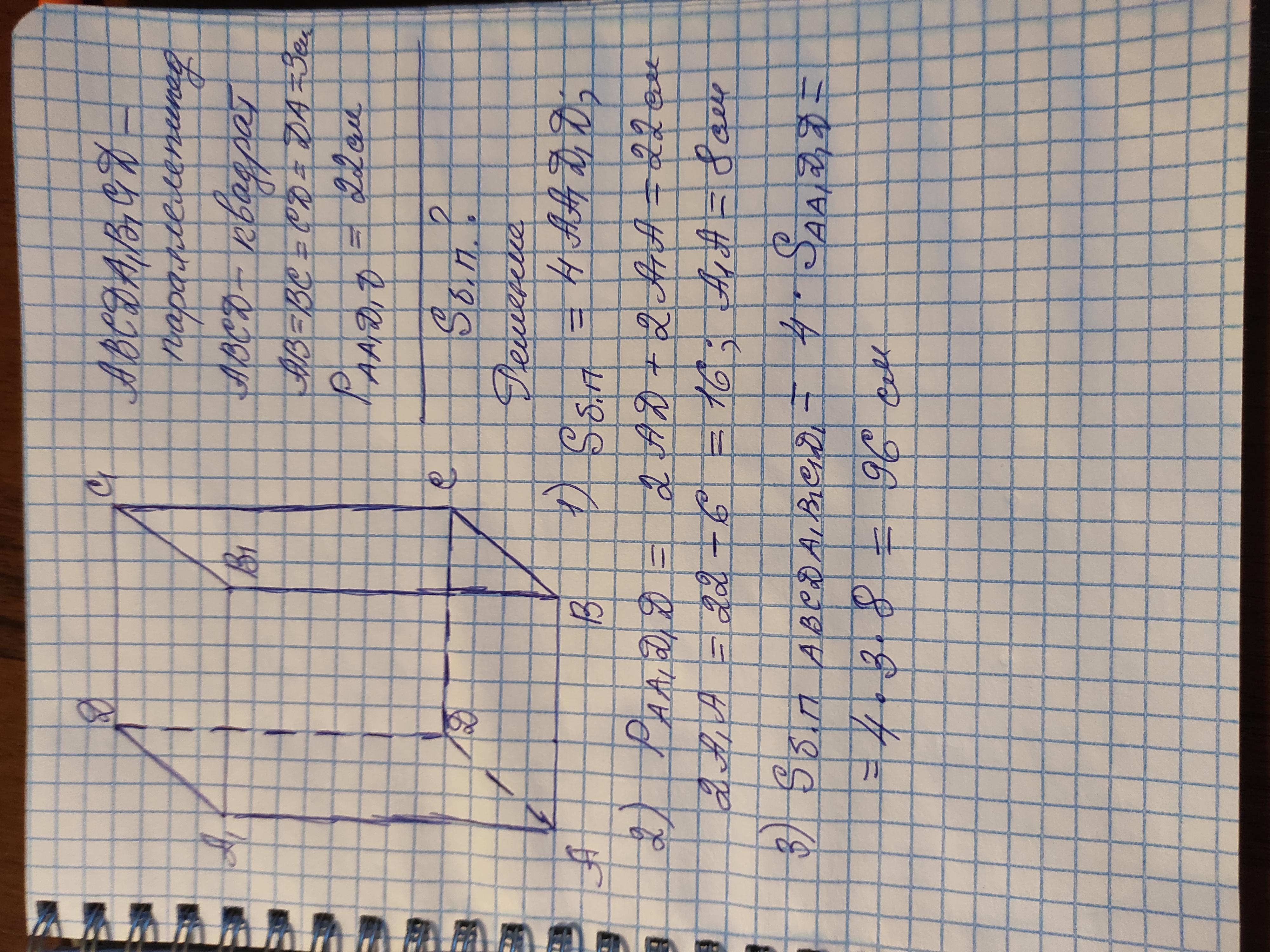 Сторона основи правильної чотирикутної призми дорівнює 3 см, а периметр і бічної грані – 22 см. Знайдіть площу бічної поверхні цієї призми.