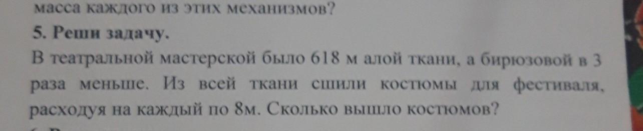 В театральной мастерской было 618 малой ткани, а бирюзовой в 3 раза меньше. Из всей ткани сшили костюмы для фестиваля, расходуя на каждый по 8м. Сколько вышло костюмов? 6 Реи задачу,