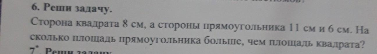 6. Реши задачу. Сторона квадрата 8 см, а стороны прямоугольника 11 см и 6 см. На 8 сколько площадь прямоугольника больше, чем площадь квадрата?