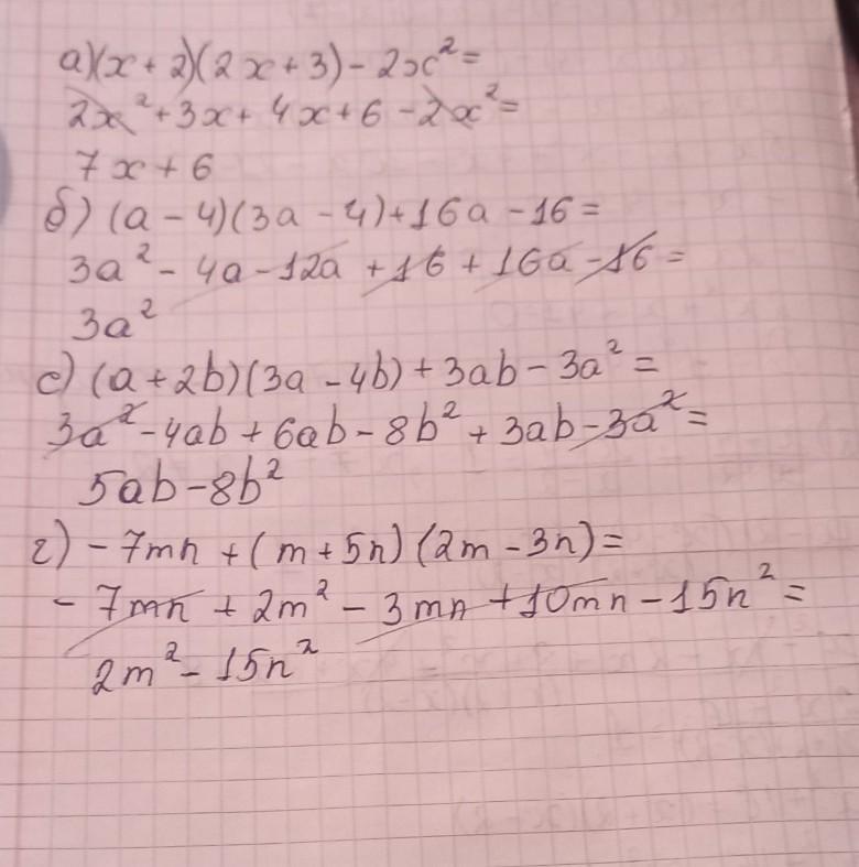в) (a + 2b)(3a – 4b) + 3ab – 3a2;
