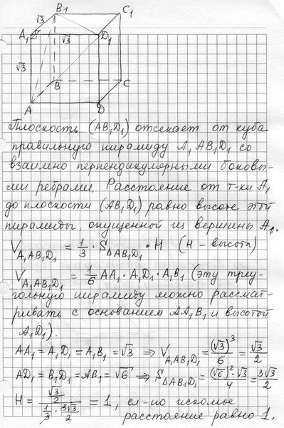 9) В кубе ABCDA1B1C1D1 с ребром 3 см найдите расстояние от вершины A1 до плоскости AB1D1 (нужно решение)