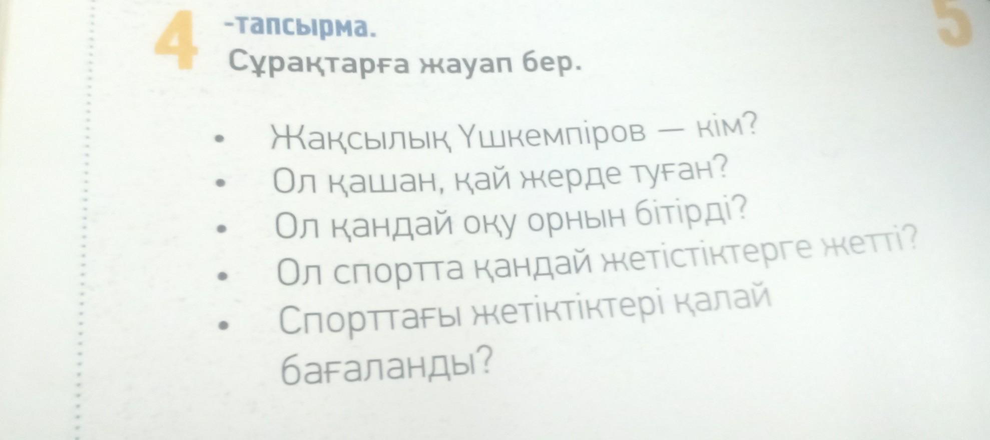 Ответ:1)Олимпиада алтынын жеңіп алған тұңғыш қазақ. Ол 80-Олимпиада өткен кезде чемпион болды.2)Туған: 1951 жылы 6 мамырда Жамбыл облысында дүниеге келген. 3)1974 жылы Семей зооветеринарлық институтын "Зоотехник" мамандығы бойынша, 1983 жылы Қазақ дене шынықтыру институтын бітірген.4)Жаксылык Ушкемпиров стал чемпионом Олимпийских игр, выиграв в первом же круге у главного фаворита, непобежденного Константина Александру из Румынии. Так и завершил он карьеру на мажорной ноте: в 1980 году Олимпиада, 1980 год - олимпийский чемпион, в 1981-м стал чемпионом мира и победителем Мемориала Ивана Поддубного, в 1982 году выиграл на международном турнире в Будапеште.5)Көп адамдарға ол ұнап жүрді.Өзіне деген құрметке ие болды,аты аңызға айналған күрескер болды.
