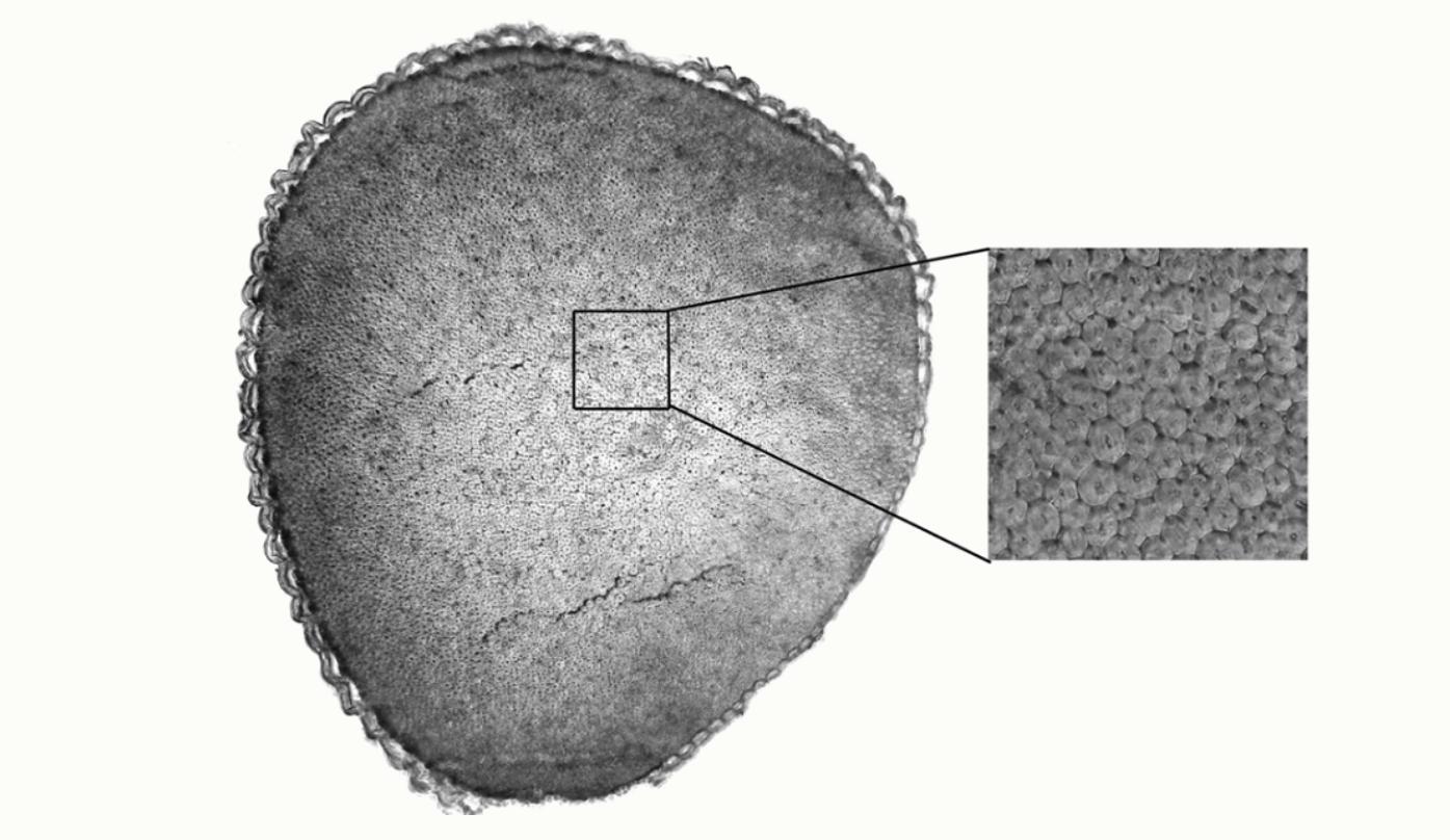 В одной из исследовательских работ, посвящённых анатомии видоизменённых листьев растений семейства Кактусовые, было представлено изображение анатомического среза. Изучите это изображение.