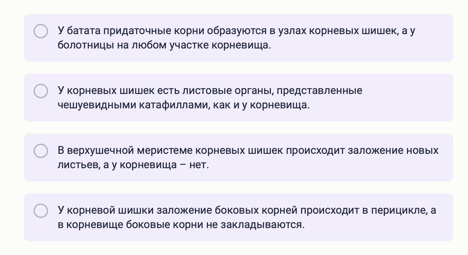 Верно последнее утверждение, т.к. корневые шишки батата - это видоизменения корней, у них могут быть боковые корни. А корневище - это видоизменение побега, на нем по определению не может быть боковых корней.