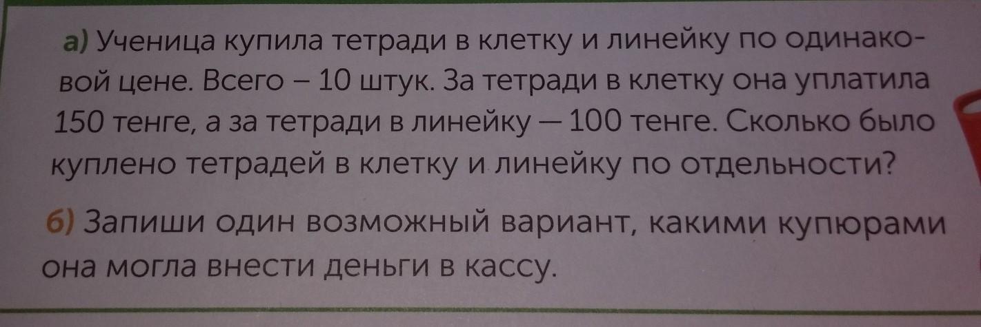 10.б)Запиши один возможный вариант,какими купюрами она могла внести деньги в кассу.