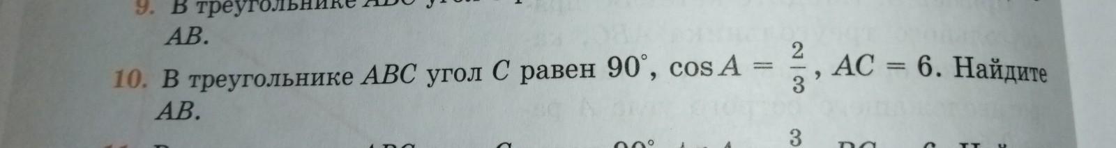 В треугольнике ABC угол C равен 90°, cosA=2/3, AC=6. Найдите AB.