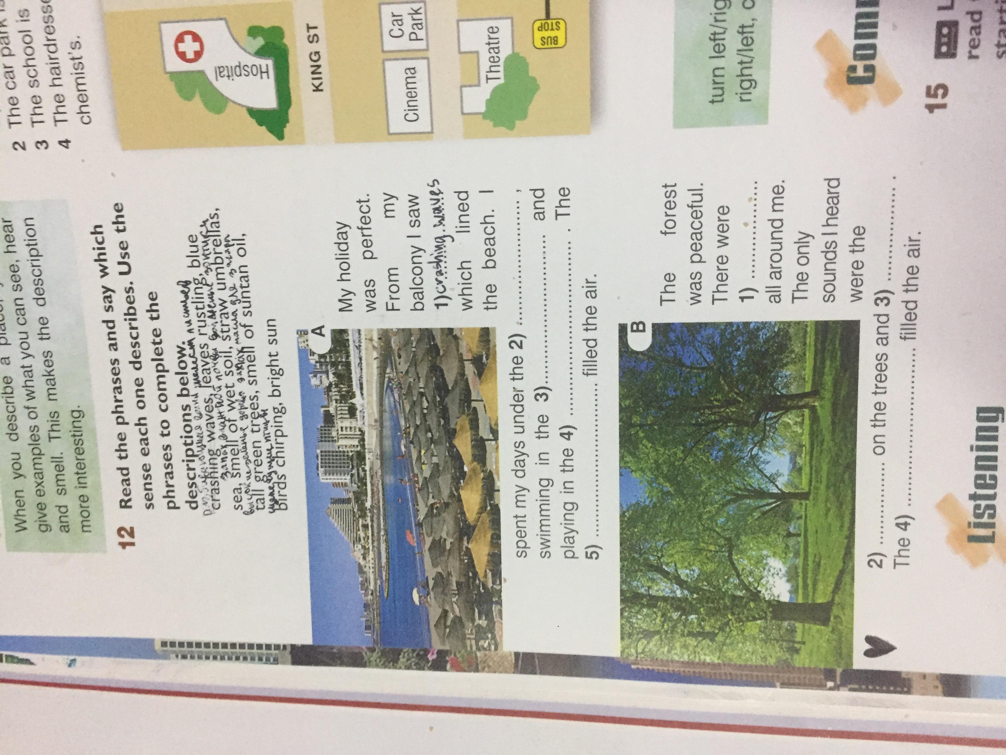 Straw umbrellas, blue sea, bright sun, smell of suntan oil, tall green trees, birds chirping, leaves rustling, smell of wet soil