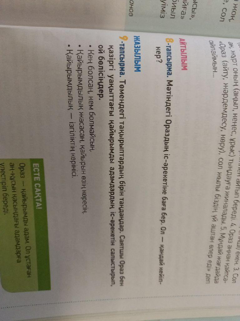 9-тапсырма. Төмендегі тақырыптардың бiрiн таңдаңдар. Саятшы Ораз бен қазіргі уақыттағы қайырымды адамдардың іс-әрекетiн салыстырып, ой белiсiндер. • Кең болсаң, кем болмайсың. • Кайырымдылық жасасаң, кайырын өзің көресің. • Кайырымдылық - iзгiлiктiн керiнiсi.