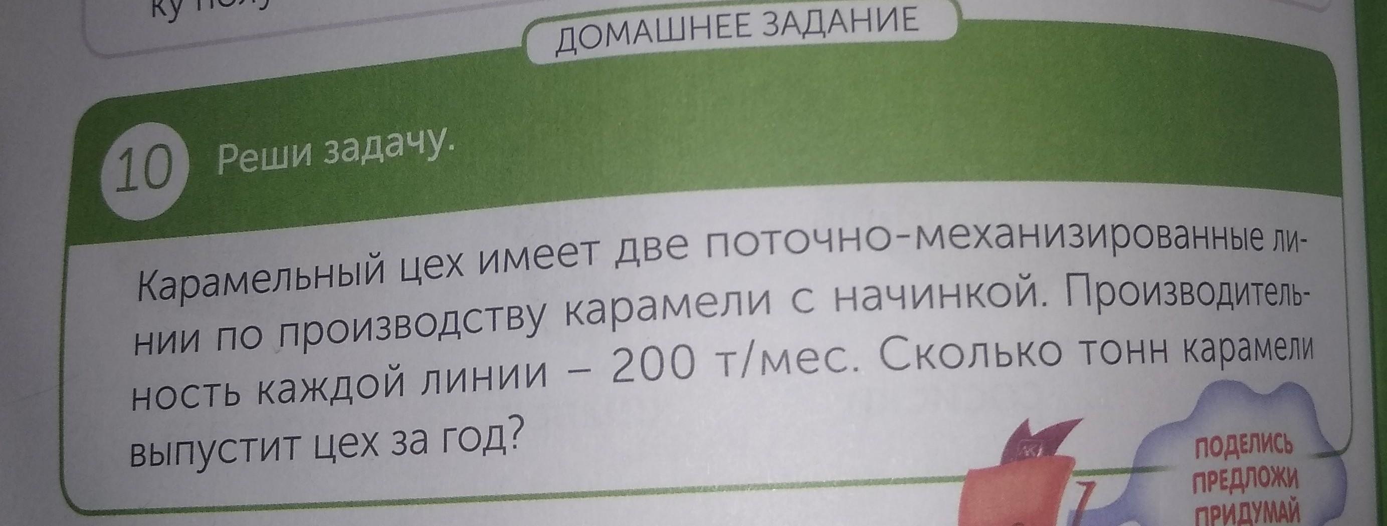 С УСЛОВИЕМ К ЗАДАЧЕ. Реши задачу. Карамельный цех имеет две поточно-механизированные ли- нии по производству карамели с начинкой. Производитель- ность каждой линии — 200 т/мес. Сколько тонн карамели выпустит цех за год?