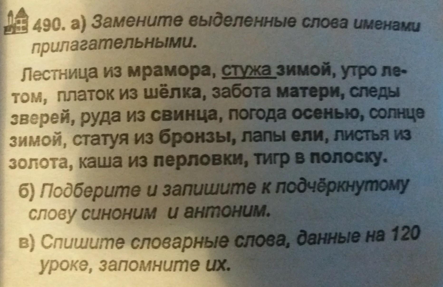 А 490. а) Заменито выделенные слова именами прилагательными. Лестница из мрамора, стука зимой, утро ле- том, платок из шёлка, забота матери, следы зверей, руда из свинца, погода осенью, солнце зимой, статуя из бронзы, лапы оли, листья из золота, каша и перловки, тигр в полоску. 6) Подберите и запишите к подчёркнутому слову синоним и антоним. в) Спишите словарные слова, данные на 120 уроке, запомните их. 8 211 ДАМ 15 БАЛЛОВ