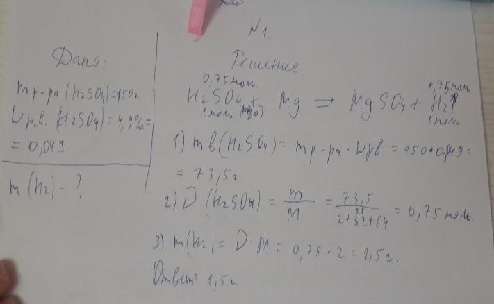 Обратите внимание, что дан 4.5% раствор, делаем вывод, что H2SO4 разбавленная (концентрированной считается свыше 50%). В дано я сразу перевела массовую долю из процентов в долю единицы, чтобы не таскать 100% с собой в решении. По уравнению реакции могу сказать: в реакциях разбавленных HNO3 H2SO4 металлов, все металлы, стоящие в ряду напряжения металлов до водорода, вытесняют вдород и образуют соль. Уравнялось без коэффициентов. 1. Первым действием нашла массу вещества H2SO4. Действия над растворами через реакцию не выполняются!!! Если дана массовая доля и масса раствора, найдите массу вещества. 2. Количество вещества я нашла, чтобы с легкостью вычислить прямо в реакции колличество водорода 0.75 моль. Если знаменатели искомого и данного вещества равны (здесь по 1 моль, из уравнения реакции), то равно и колличество вещества в числителе. 3. Массу водорода перевела из количества в массу умножением на молярную массу.