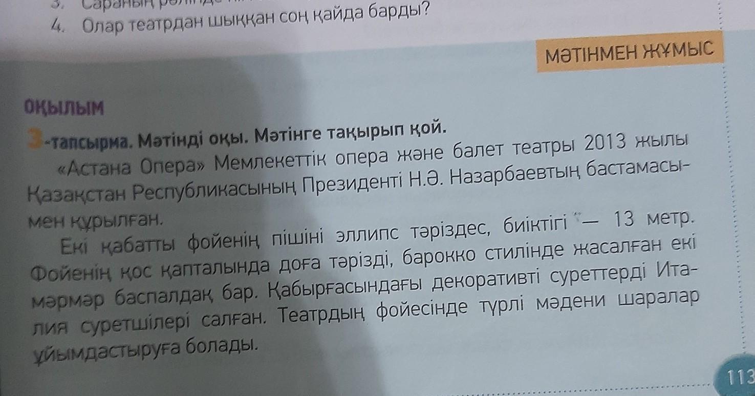 ТЫҢДАЛЫМ -тапсырма. Диалогті тыңда. Сұрақтарға жауап бер. 1. Олар қай театрға барды? 2. Олар қандай қойылымға билет алды? 3. Сараның рөлінде кім ойнайды? 4. Олар театрдан шыққан соң қайда барды?текст я сфотографировала пж помогите