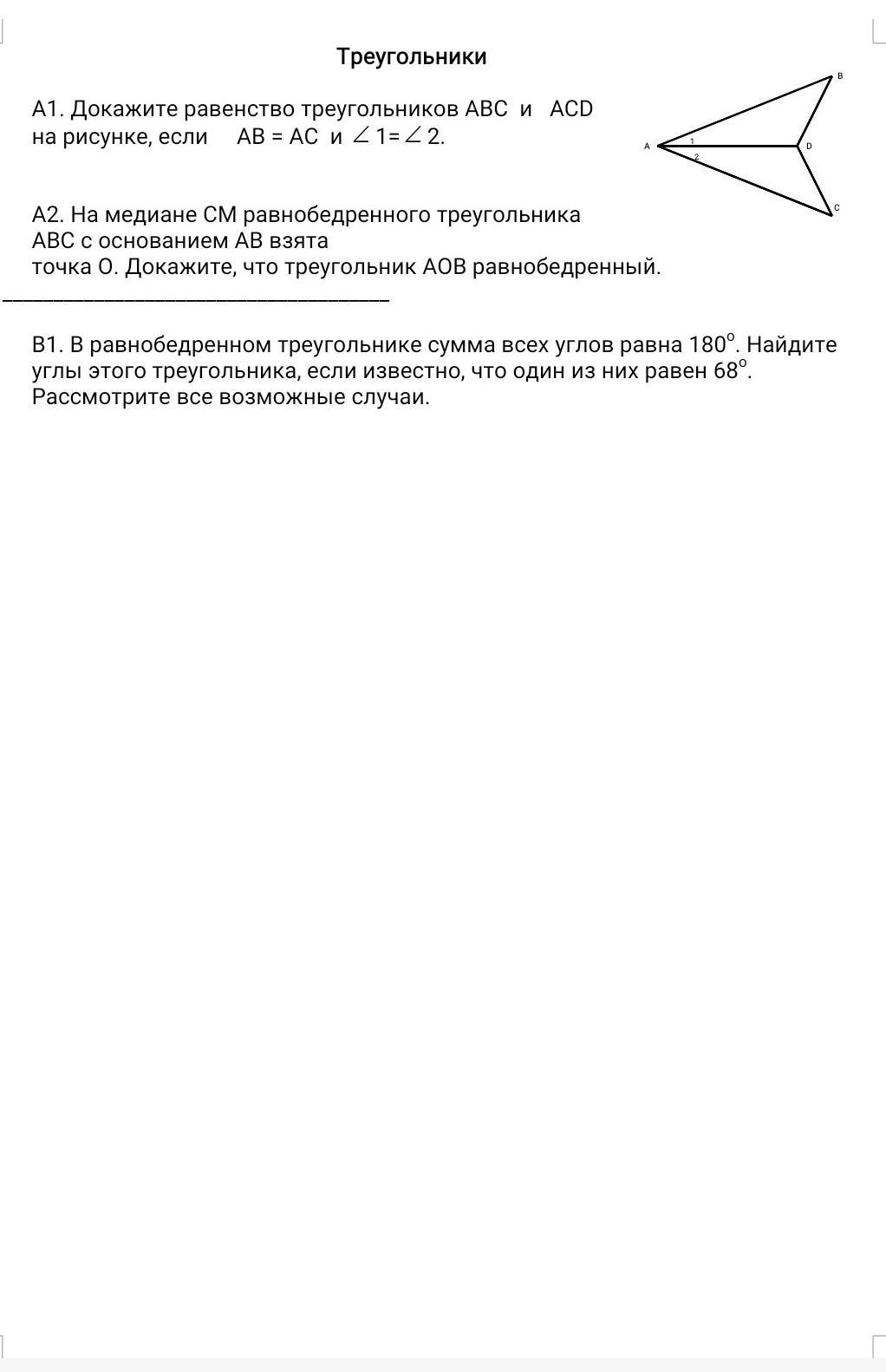 Ответ:А1)одно основная линия пересечения, там углы 1 и 2 равны этого уже достаточно, А2) это понятно одно основание и одна вершина, соответственно он станет равнобедренным, Б1) 1 случай если один из углов основания, 68 то тогда и правый и леву будут 68, прибавляем их 68+68=136градусов, потом что узнатьв ершину я делаю так 180-136=44градусов вершина найдена, 2 случай когда вершина это 68 градусов, тут все просто 180-68=112градусов это сумма двух углов основания, разделяем т.к углов два, 112:2=56градусов это грудус одного из двух углов основания
