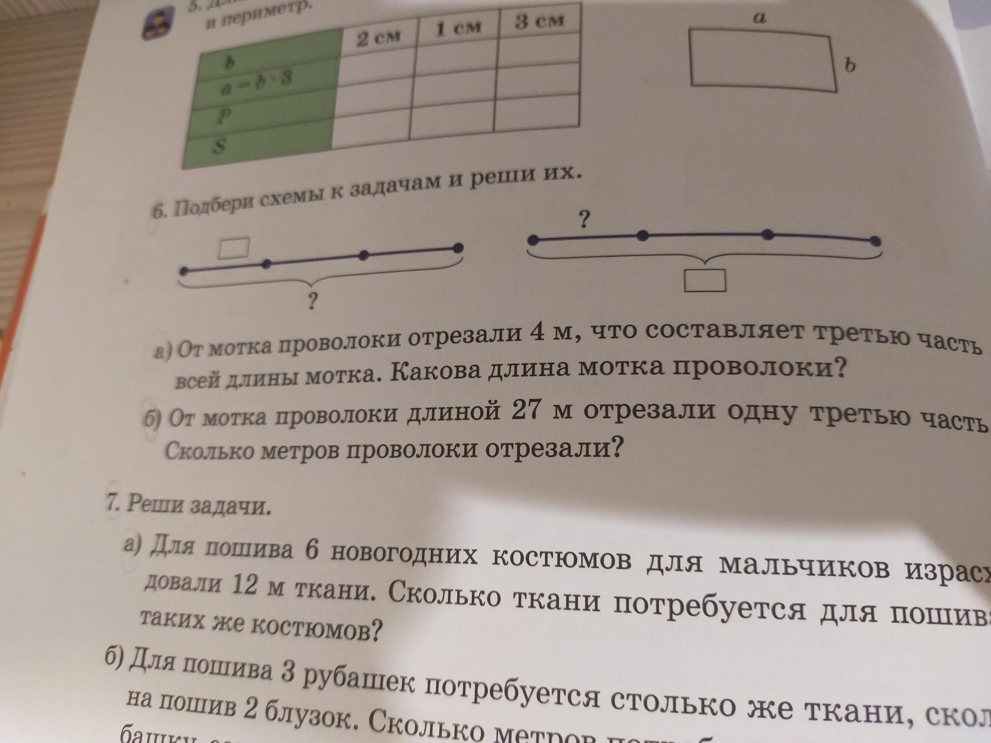 2 Задача: длина всего мотка равна 27 метров, отрезали 1/3 часть, следовательно, отрезали 27/3=9 метров