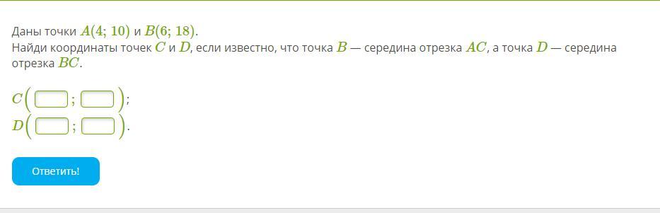 Найди координаты точек C и D, если известно, что точка B — середина отрезка AC, а точка D — середина отрезка BC.