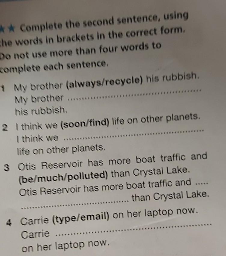 Привет. 1) recycle , 2) soon , 3) polluted, 4) type.