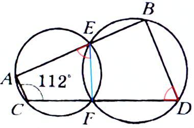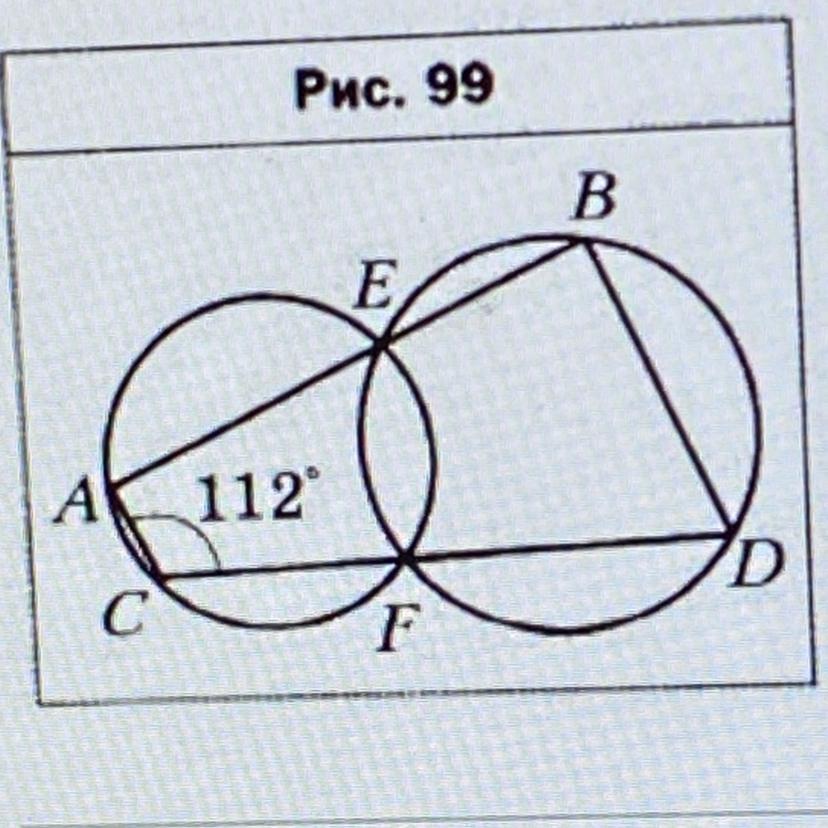 Две окружности пересекаются в точках Е и F. Прямая, проходящая через точку Е, пересекает окружности в точках А и В, а прямая, проходящая через точку F, — в точках С и D (рис. 99). Найдите угол BDC, если ∠ACD = 112°.