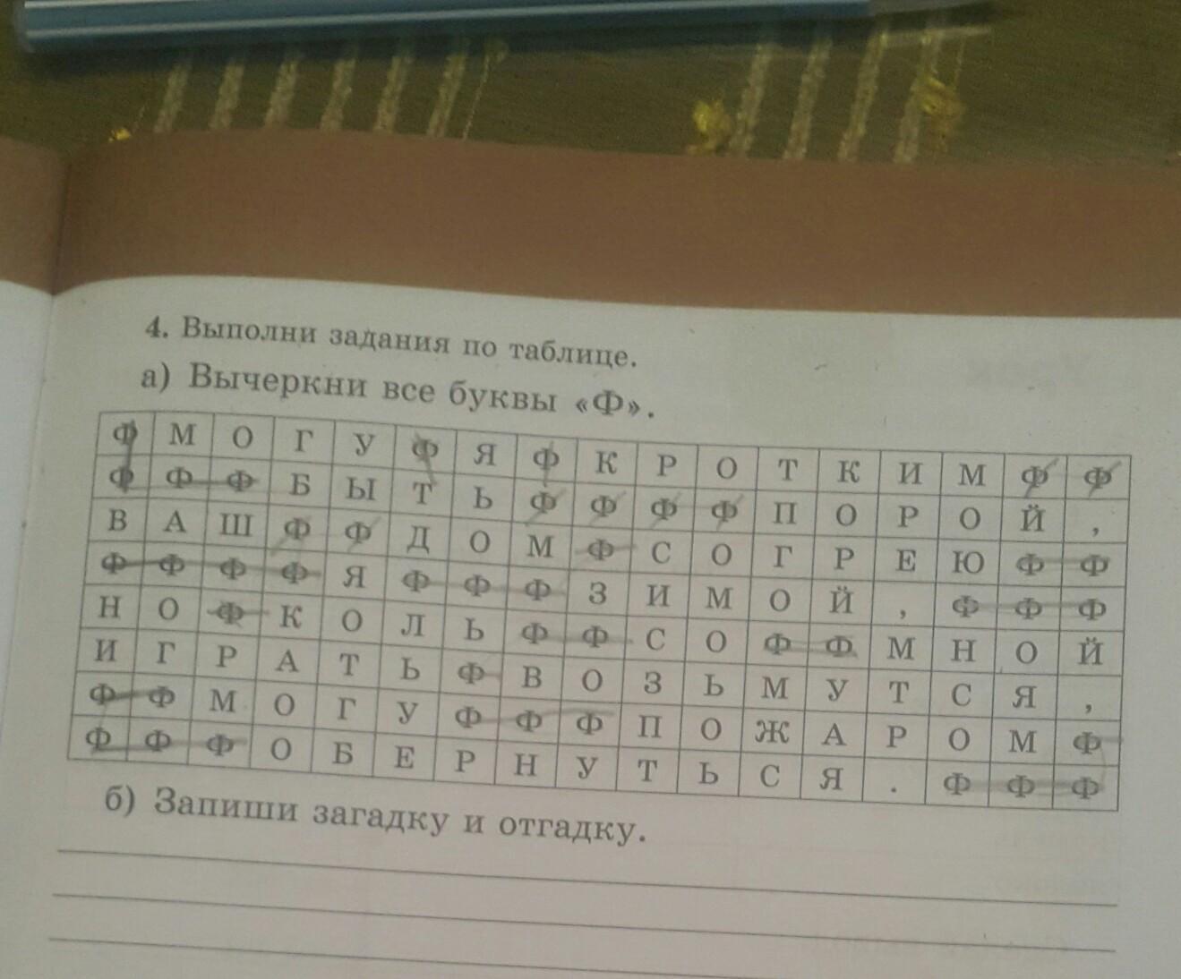 ФМ M ой 4. Выполни задания по таблице. а) Вычеркни все буквы «Ф». 0 Г У Я ФК P о T КИ МФФ M ФБЫТ T Ь У Ф Ф Ф IT 0P ВАШ Ф Ф до B M Ф С О T P. ЕЮ Ф фффф Я ФФ ФФ З и мой Но Ф K Оль ФФ С О ФФ M H иг ГРАТЬ озь M У T СЯ M О Г У ф Ф П ОЖАР 0 M О Б E P У T Ь С Я 5 Ее е ее се е Ф ой T Ф Ф фф б) Запиши загадку и отгадку.