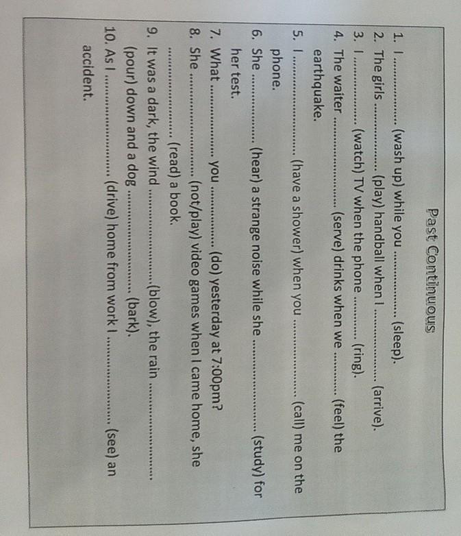 Past Continuous ......... a 1. 1........ (wash up) while you .... (sleep). 2. The girls ....... (play) handball when I ................ (arrive). 3. .......... (watch) TV when the phone ............. (ring). 4. The waiter .... (serve) drinks when we ........... (feel) the earthquake. 5. L... (have a shower) when you (call) me on the phone. 6. She ... (hear) a strange noise while she (study) for her test. 7. What. you ... ...... (do) yesterday at 7:00pm? 8. She ....... (not/play) video games when I came home, she ......... (read) a book 9. It was a dark, the wind (blow), the rain (pour) down and a dog (bark). 10. Asl....... ................ (drive) home from work! (see) an accident. *****