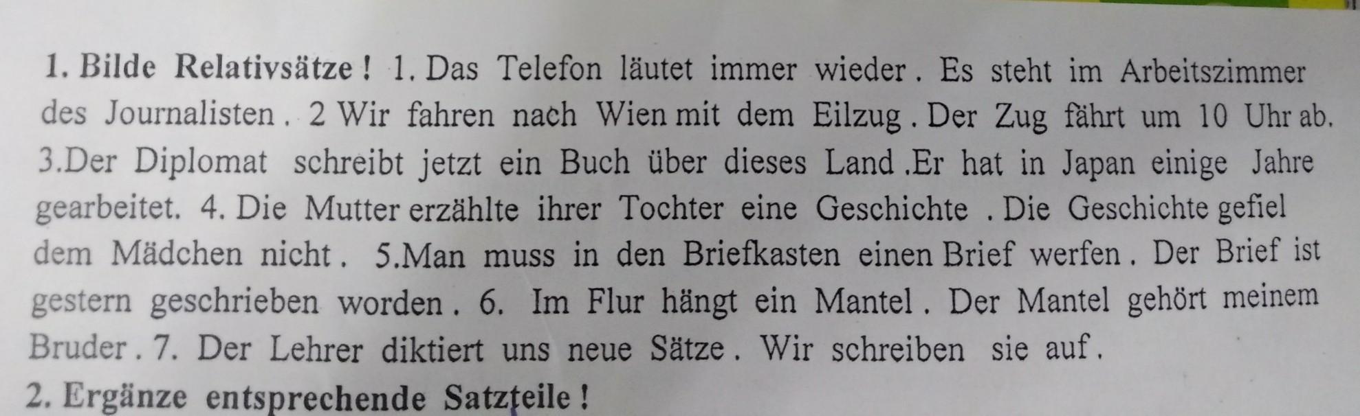 1. Bilde Relativsätze ! 1. Das Telefon läutet immer wieder. Es steht im Arbeitszimmer des Journalisten. 2 Wir fahren nach Wien mit dem Eilzug. Der Zug fährt um 10 Uhr ab. 3.Der Diplomat schreibt jetzt ein Buch über dieses Land.Er hat in Japan einige Jahre gearbeitet. 4. Die Mutter erzählte ihrer Tochter eine Geschichte. Die Geschichte gefiel dem Mädchen nicht. 5.Man muss in den Briefkasten einen Brief werfen. Der Brief ist gestern geschrieben worden. 6. Im Flur hängt ein Mantel. Der Mantel gehört meinem Bruder. 7. Der Lehrer diktiert uns neue Sätze. Wir schreiben sie auf.