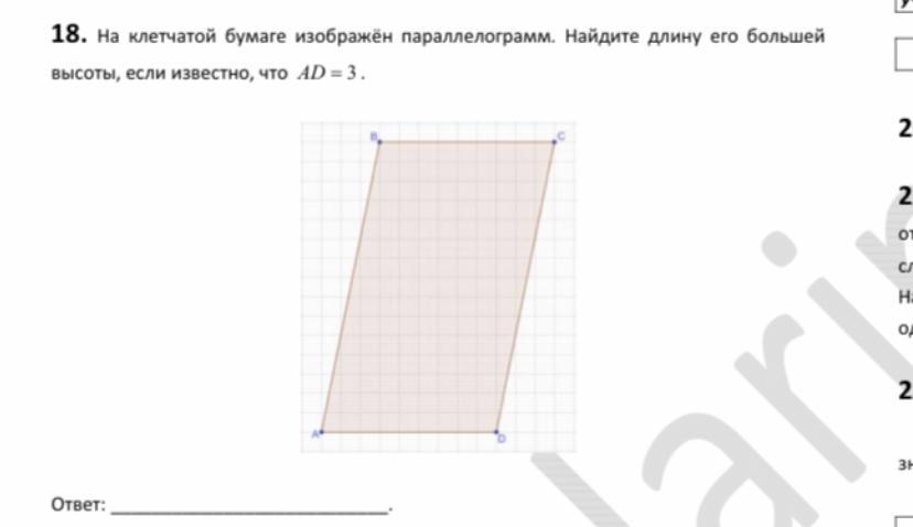 на клетчатой бумаге изображен параллелограмм найдите длину его большей высоты если AD=3
