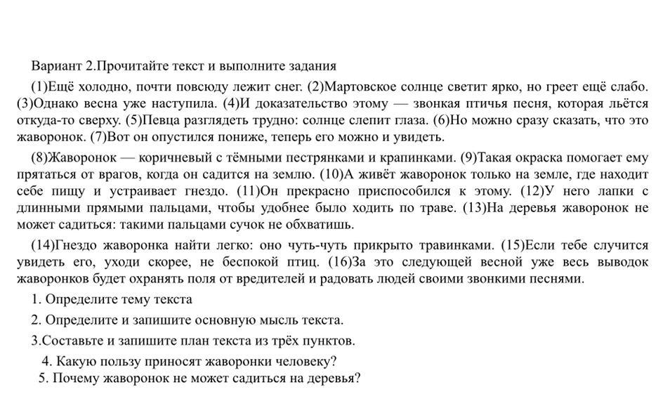 (1)Ещё холодно, почти повсюду лежит снег. (2)Мартовское солнце светит ярко, но греет ещё слабо. (3)Однако весна уже наступила. (4)И доказательство этому — звонкая птичья песня, которая льётся откуда-то сверху. (5)Певца разглядеть трудно: солнце слепит глаза. (6)Но можно сразу сказать, что это жаворонок. (7)Вот он опустился пониже, теперь его можно и увидеть.