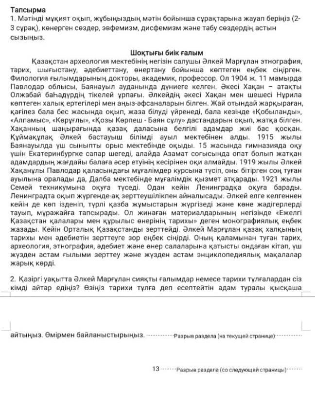 1.Мәтінді мұқият оқып, жұбыңыздың мәтін бойынша сұрақтарына жауап беріңіз (2-3 сұрақ), көнерген сөздерін, эвфемизм, дисфемизм, табу сөздерінің астын сызыңыз.